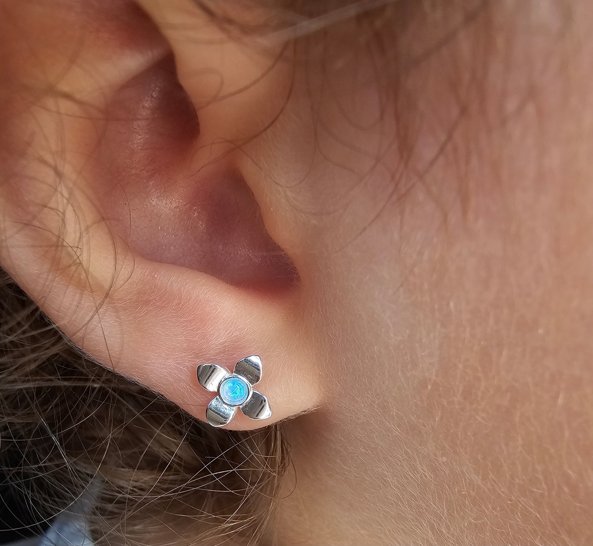 Petite flower studs with a soft blue synthetic opal center set in 925 sterling silver — Opal Dream brings a gentle shimmer and playful color to little ears. Lightweight and hypoallergenic, these studs are designed for babies, toddlers and anyone who loves a delicate, everyday sparkle.