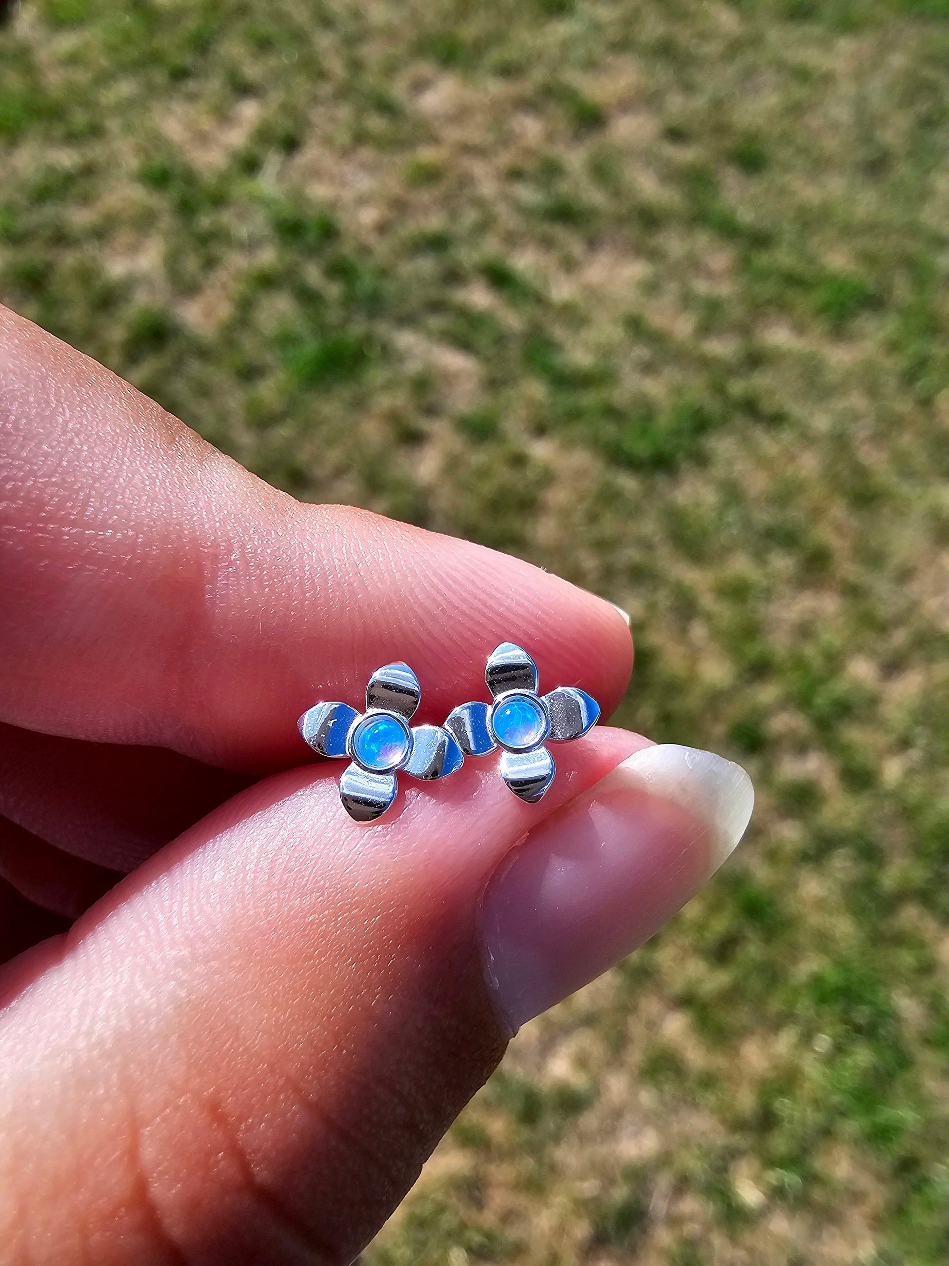 Sterling Silver Opal Flower Stud Earrings — Tiny Blue Opal, Hypoallergenic